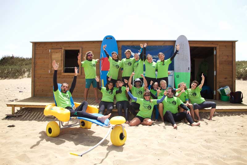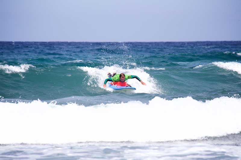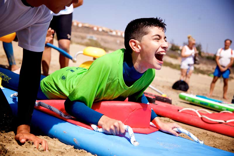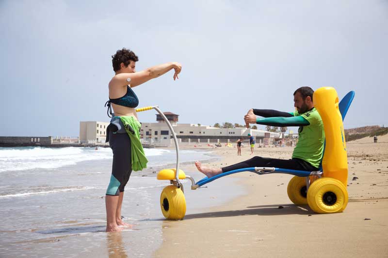 With years of experience with people with functional diversity and licensed by the Canarian Surf Federation, our instructors work in team with psychometricians and physiotherapists to adapt the class to each participant. As the disabilities are very different, each one needs a personalized approach. For this reason, our team develops a plan with specific objectives and methods for each pupil and with the help of special tools, such as amphibious chairs and adapted surfboards.